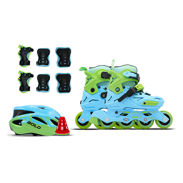 The Bold 102 Adjustable Combo Skate Set in blue, pink, and black is a complete and ideal package for starting skating for kids. This set includes the adjustable skate shoes, helmet, knee pads, elbow pads, wrist pads, allen key, training obstacle, and sticker, providing everything for a professional start.